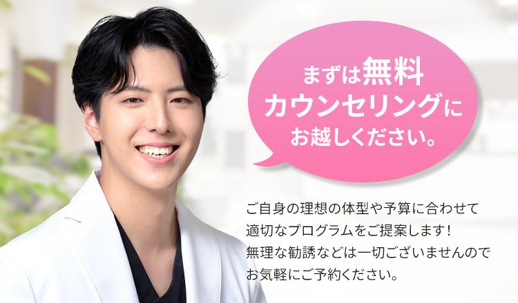 医療ダイエットは、運動が苦手な方や継続ができない方、食事制限をしても思ったように痩せられなかった方におすすめです。料金やダウンタイムなど、患者様のニーズに合わせて適切な治療をご提案させていただきます。まずは無料カウンセリングでご相談ください。